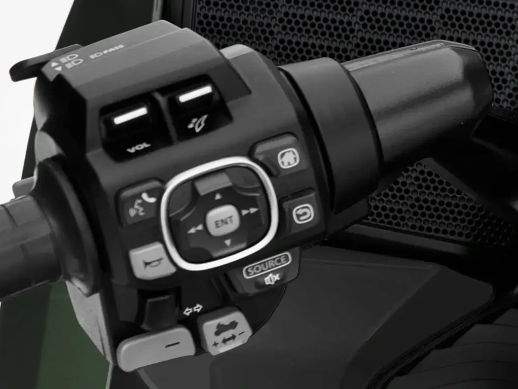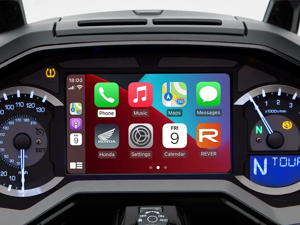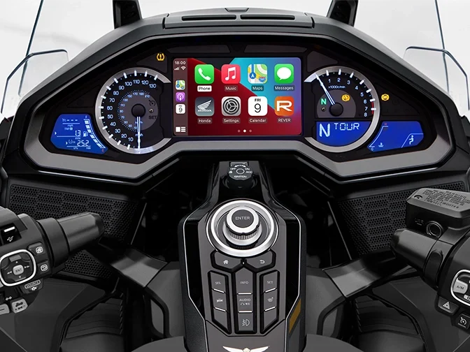 O painel de instrumentos da Honda Gold Wing é compacto e de fácil leitura. Conecte seu smartphone e acesse mapas, música e comunicação diretamente do painel da moto, mantendo-se sempre conectado e informado.