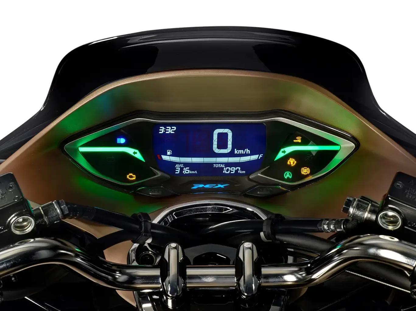 Totalmente digital, o painel da Honda PCX conta com display Blackout, que permite uma leitura mais fácil e ágil da moto, com velocímetro, relógio, indicador de combustível e registro de consumo médio, além de hodômetro total e parcial.