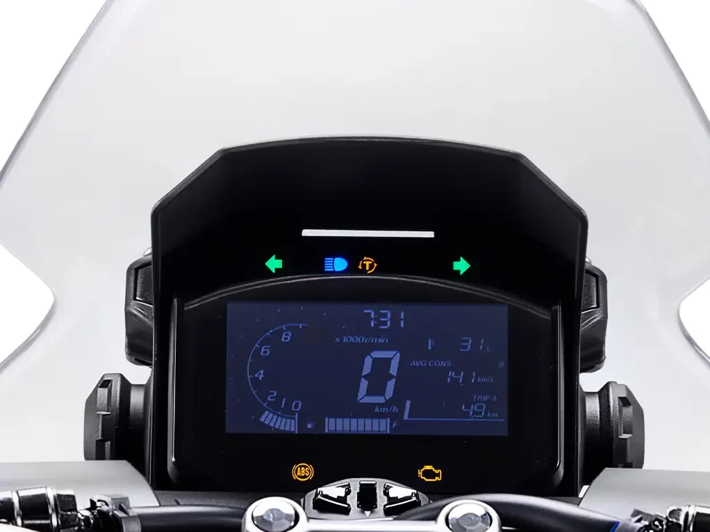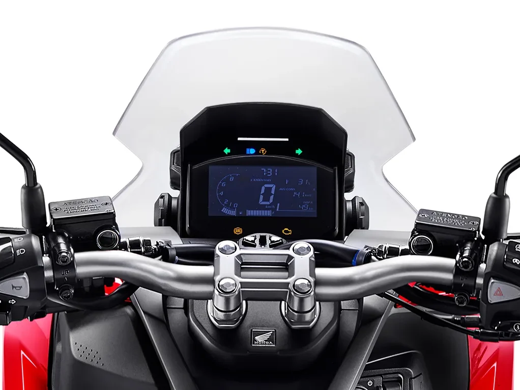 O novo painel dessa scooter, com estilo 100% reformulado, combina com a sua próxima aventura. Com ele, você tem todas as informações à sua disposição: relógio, indicador de troca de óleo e de nível de gasolina, velocímetro, hodômetro total e parcial, registro de consumo médio e instantâneo de combustível, temperatura ambiente, nível de carga da bateria, conta-giros, além do botão seletor multifunção em nova posição, tornando sua scooter mais prática e ergonômica.