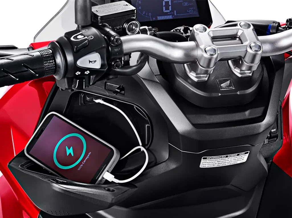 A Honda ADV é conectada ao seu estilo de vida. Por isso, o porta-objetos conta com uma nova entrada USB-C para carregar o seu smartphone.
