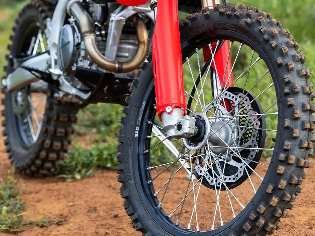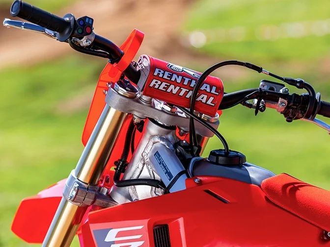 O modelo RX da CRF 250 possui ângulo de trail e cáster diferenciado, garantindo mais estabilidade em alta velocidade, redução nas vibrações e resposta mais aprimorada para quem pilota.