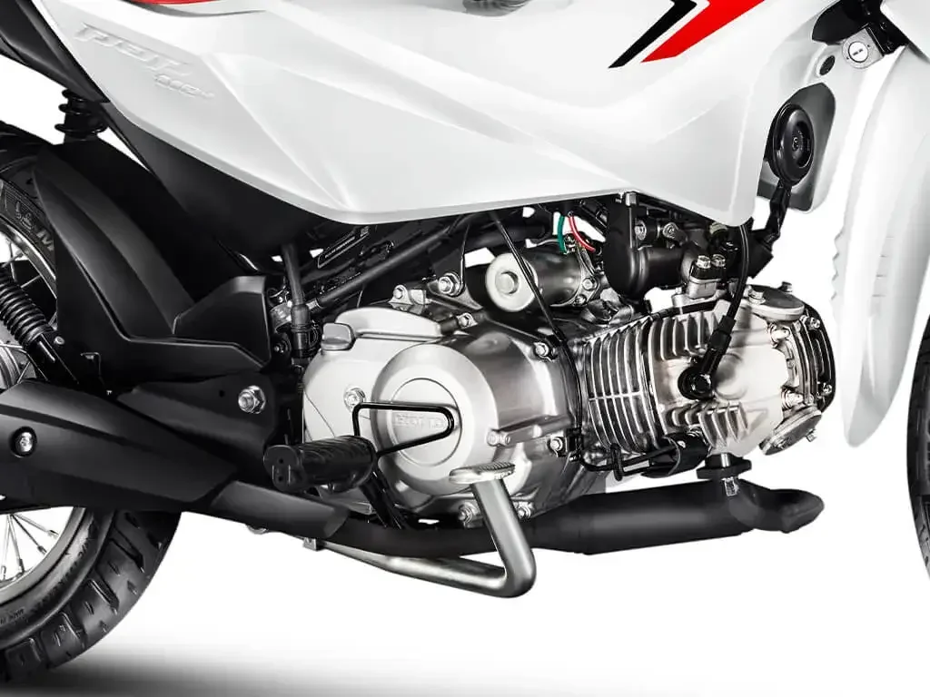 Novo conjunto, com câmbio semiautomático e rotativo de 4 marchas. Dispensa a utilização do manete de embreagem e torna a pilotagem ainda mais fácil e confortável.