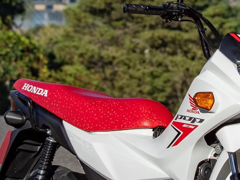 O assento largo da Pop torna a pilotagem mais prazerosa e ergonômica. Além disso, seu desenho texturizado colabora para um visual moderno e maior segurança, por ser antideslizante.